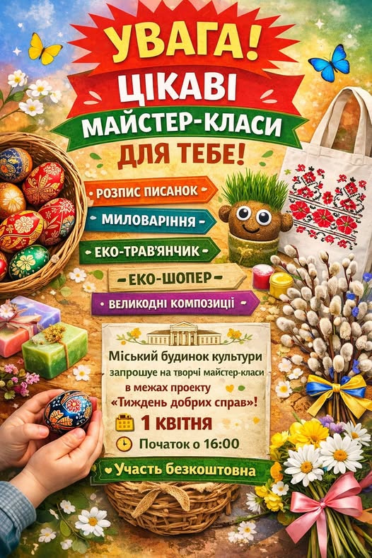 - Писанкарство (вік 10+): розпис натуральних яєць традиційними українськими орнаментами.